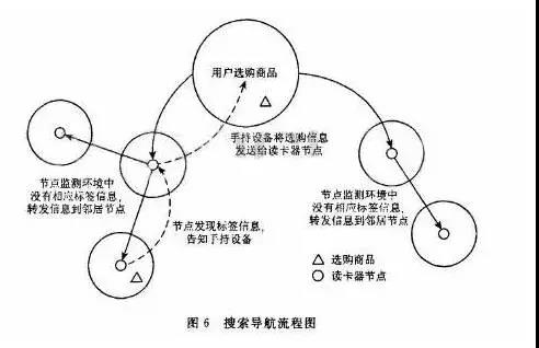 當(dāng)選擇好商品后,手持設(shè)備將購(gòu)置信息傳給讀卡器節(jié)點(diǎn),讀卡器節(jié)點(diǎn)讀取其監(jiān)測(cè)環(huán)境中的標(biāo)簽信息,如果某讀卡器節(jié)點(diǎn)范圍內(nèi)沒(méi)有相關(guān)物品信息,則傳送信息給其鄰居讀卡器節(jié)點(diǎn),直到找到相關(guān)物品。同時(shí)將物品的位置信息返回手持設(shè)備,獲取當(dāng)前位置信息和物品信息,自動(dòng)選擇一條最優(yōu)路徑引導(dǎo)顧客購(gòu)物。搜索導(dǎo)航流程圖如圖6所示。